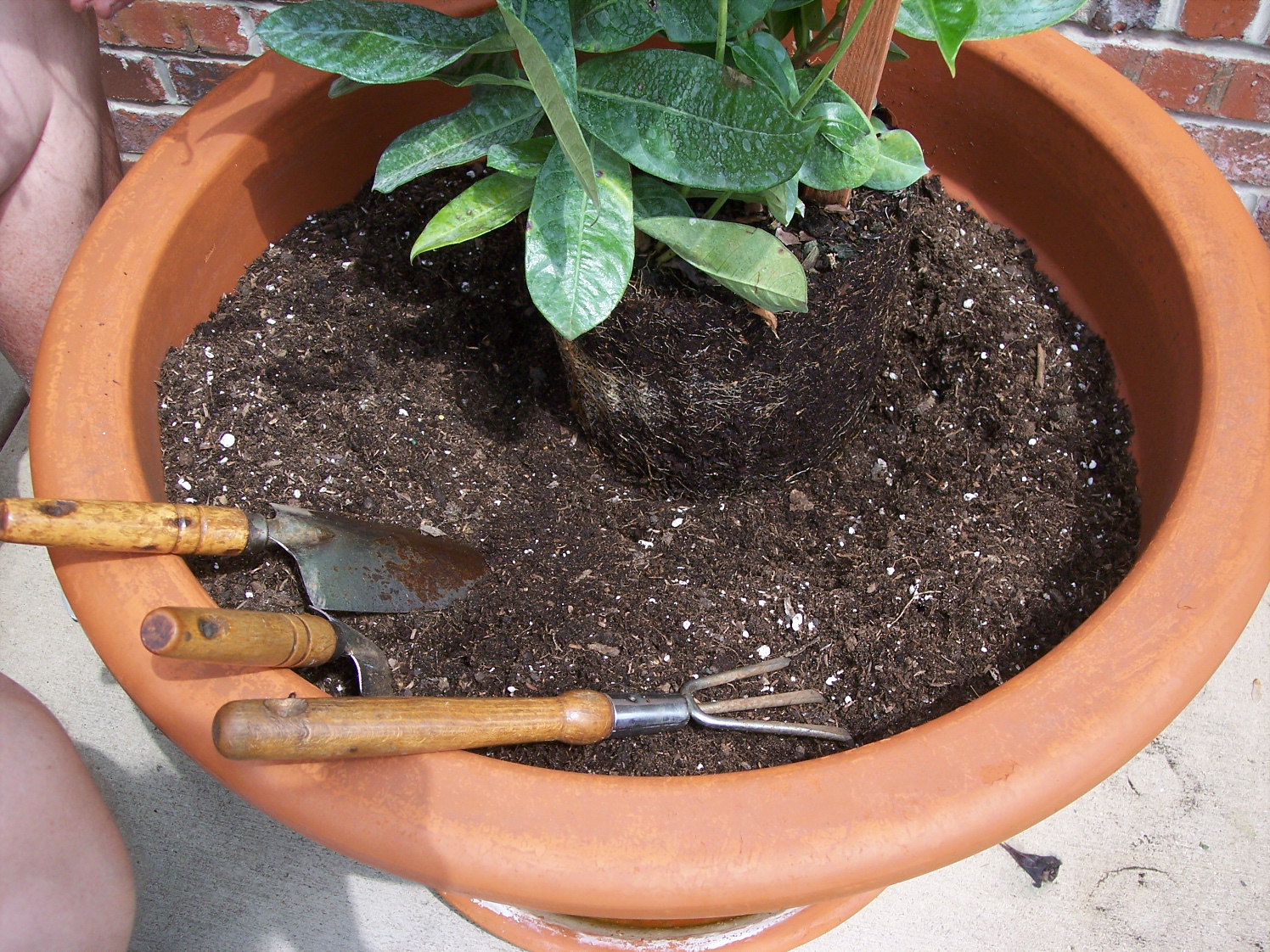 Here he spoons out a divet to place the flower into.